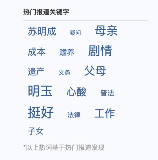 不到一個月的播出期,《都挺好》承包微博熱搜近百次,“蘇明成”、“蘇明玉”、“蘇大強”成為早春最熱話題,這也與慧科訊業抓取到的熱門報道關鍵字結果高度吻合?!岸纪谩钡臒衢T報道中,“明玉”、“蘇明成”、“劇情”、“母親”高頻出現。