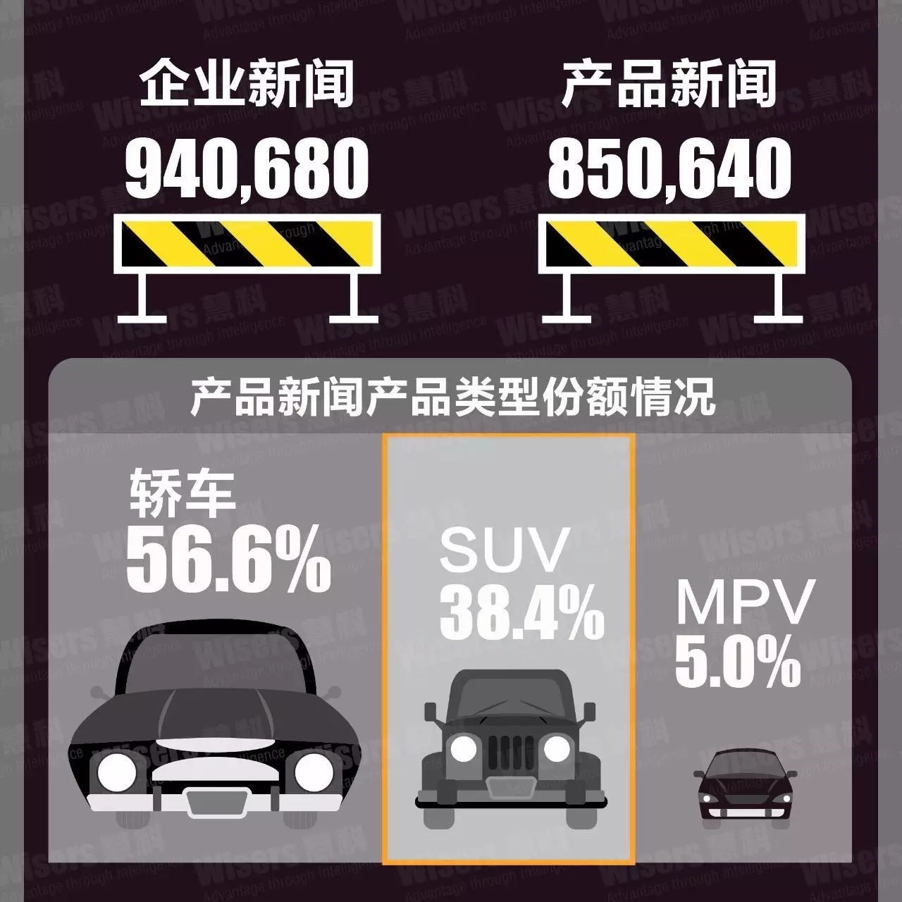 9月共監測到汽車行業傳播信息1791320篇,較上月2153666篇,環比下降16.8%。其中,企業新聞940680篇,占汽車行業新聞監測總量的52.5%;產品新聞850640篇,占汽車行業新聞監測總量的47.5%。產品新聞中,轎車以481478篇新聞占產品新聞監測總量的56.6%,SUV以326361篇新聞占產品新聞監測總量的38.4%,MPV以42801篇新聞占產品新聞監測總量的5.0%。