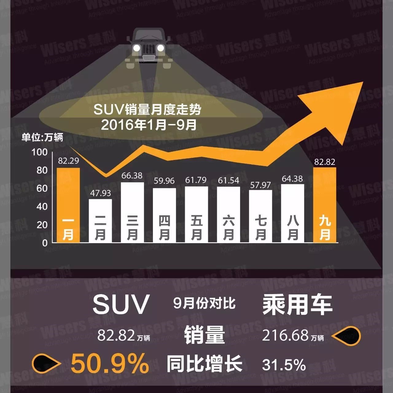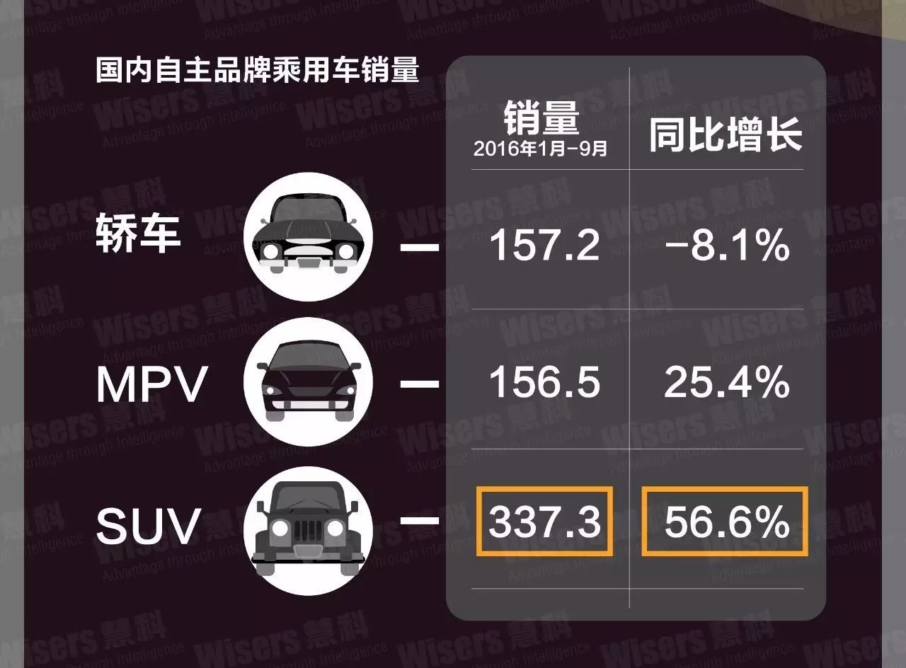 再看2016年1-9月國內自主品牌乘用車銷量數據統計,自主品牌SUV車型的銷量首次超過自主品牌轎車,同比增長56.6%。