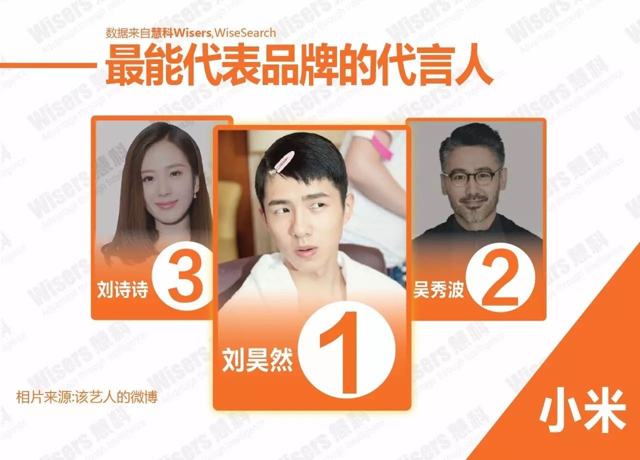 而小米三位代言人,如果說對于品牌貢獻的影響力,我們不由地首先想到劉詩詩,這位剛剛與吳奇隆大婚的國民女神。然而與品牌契合度最高且最能代表小米品牌的卻是國民學弟劉昊然,不知道這一次,雷軍是看上劉昊然哪一點了呢?但小編認為,當下小鮮肉還是最受熱捧的!從目前數據看起來,也是小米代言人與品牌契合度最高。