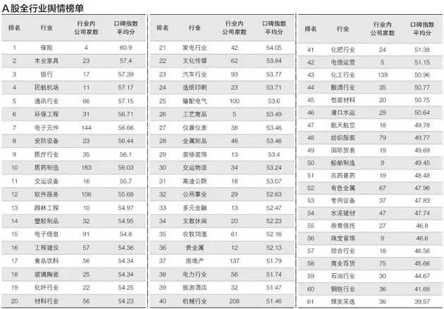 俗話說得好:“三百六十行,行行出狀元”。2016中國上市公司口碑榜活動將A股所有上市公司按照行業(yè)口徑分類后,統(tǒng)計(jì)了各行業(yè)的輿情指數(shù),形成了一張A股全行業(yè)輿情榜。在該榜單中,保險(xiǎn)行業(yè)最終奪魁,成為此次行業(yè)輿情榜的“狀元”。