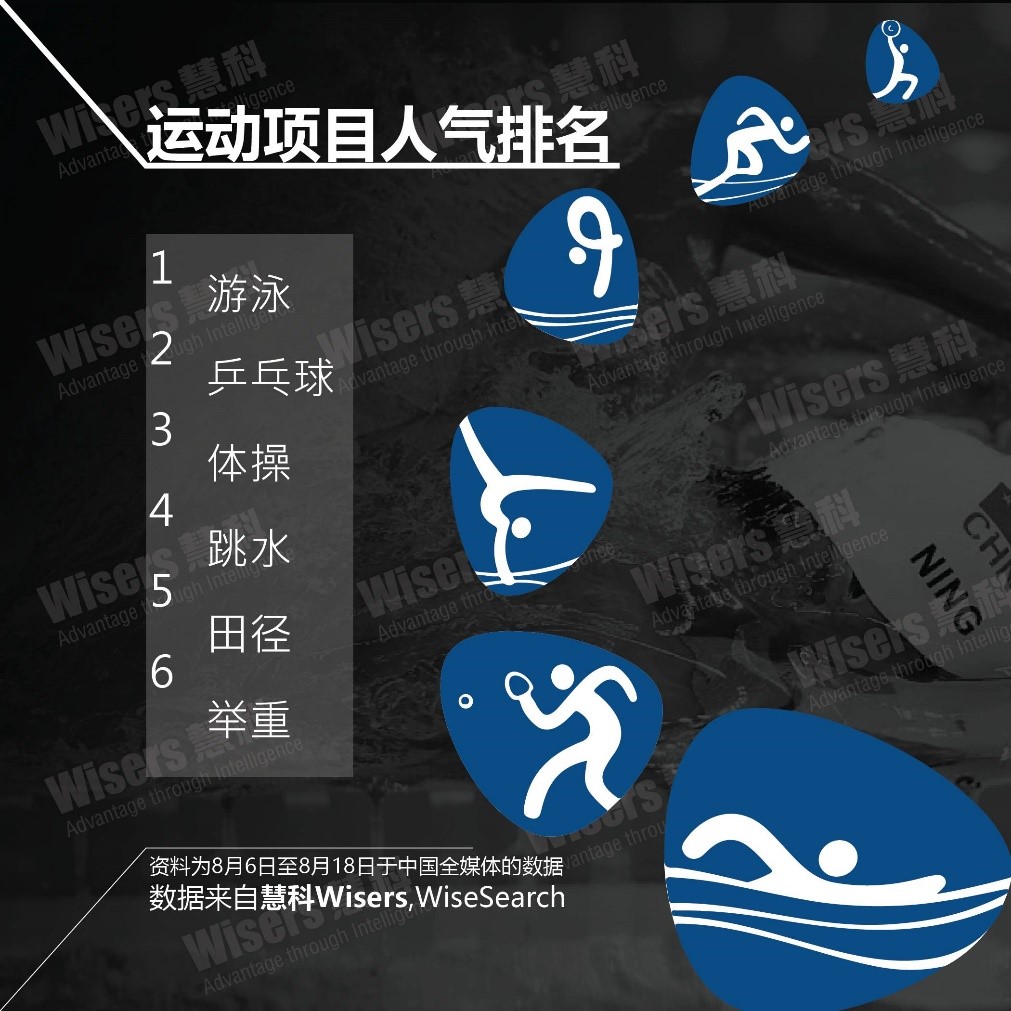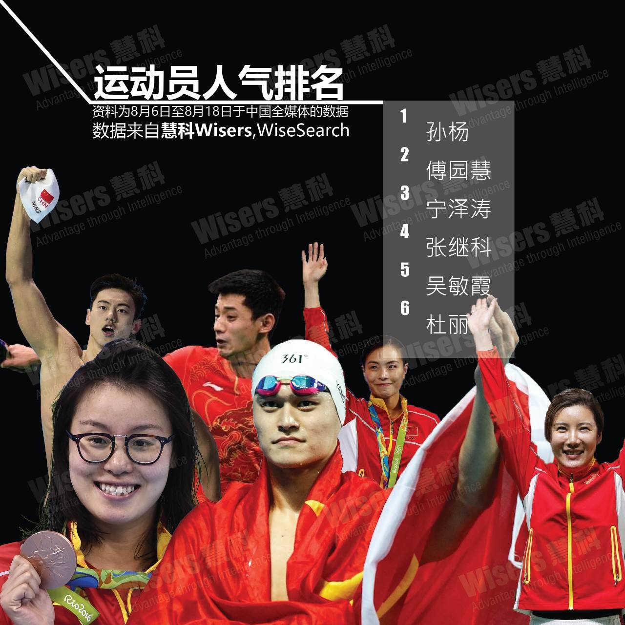 奧運從8月6日到現在,各項賽事也接近尾聲,各國運動員也都施展渾身解數,爭奪各項獎牌,比賽不但吸睛,在網絡上更是起廣泛熱議。其中中國游泳隊內泳界王者孫楊、洪荒之力傅園慧及白滑小鮮肉寧澤濤更占據了今次出戰奧運的中國運動員人氣排行榜的頭五名,而他們也在比賽中取得耀眼的成績,在這個世界性的運動舞臺上打下漂亮的一仗,為中國、為自己嬴得榮耀。