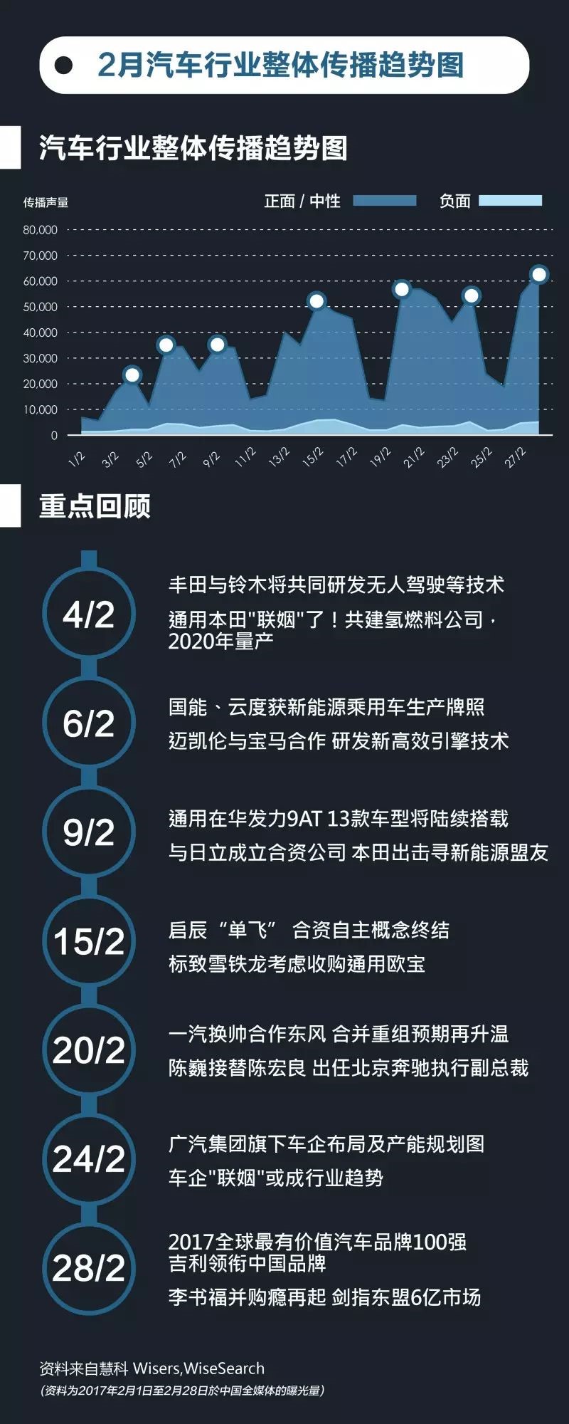 透過慧科大數據平臺監測到2月汽車行業整體傳播相對均勻,工作日期間走高,節假日期間走低,呈脈沖式規律發展。 2月28日,汽車行業新聞以66579篇的傳播量達到峰值,主要傳播內容為“2017全球最有價值汽車品牌100強 吉利領銜中國品牌”“李書福并購癮再起 劍指東盟6億市場”等。