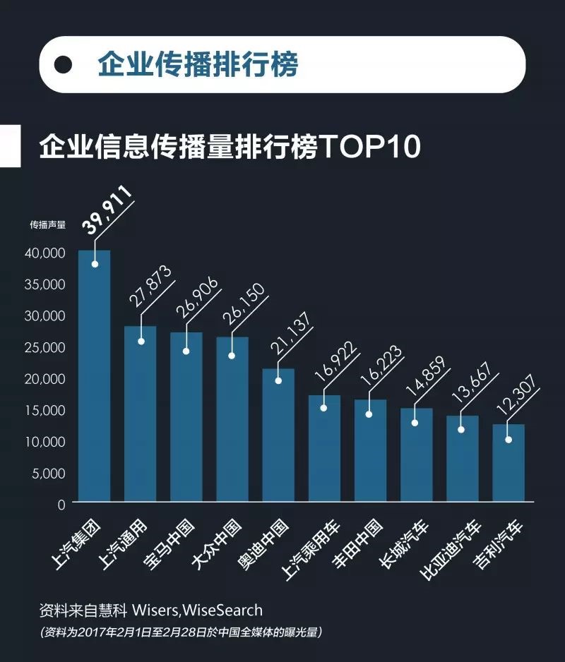 企業信息傳播聲量TOP10車企中,合資車企占1席,為上汽通用;自主車企占5席,自主車企數月來第一次TOP10排行過半,分別為上汽集團、 上汽乘用車、長城汽車、比亞迪汽車、吉利汽車;外資車企占4席,分別為寶馬中國、大眾中國、奧迪中國、豐田中國。上汽集團以39911篇的傳播聲量,位于企業信息整體傳播聲量第一位。上汽通用、寶馬中國則分列第二、第三位。