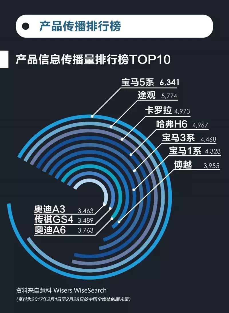 產品傳播聲量TOP10中,轎車占6席,SUV占4席,MPV則無任一款車型進入TOP10排行榜。 與往月相比,本月SUV表現較為突出,幾近與轎車各占半壁江山,途觀、哈弗H6、博越、傳祺GS4等SUV車型紛紛上榜。