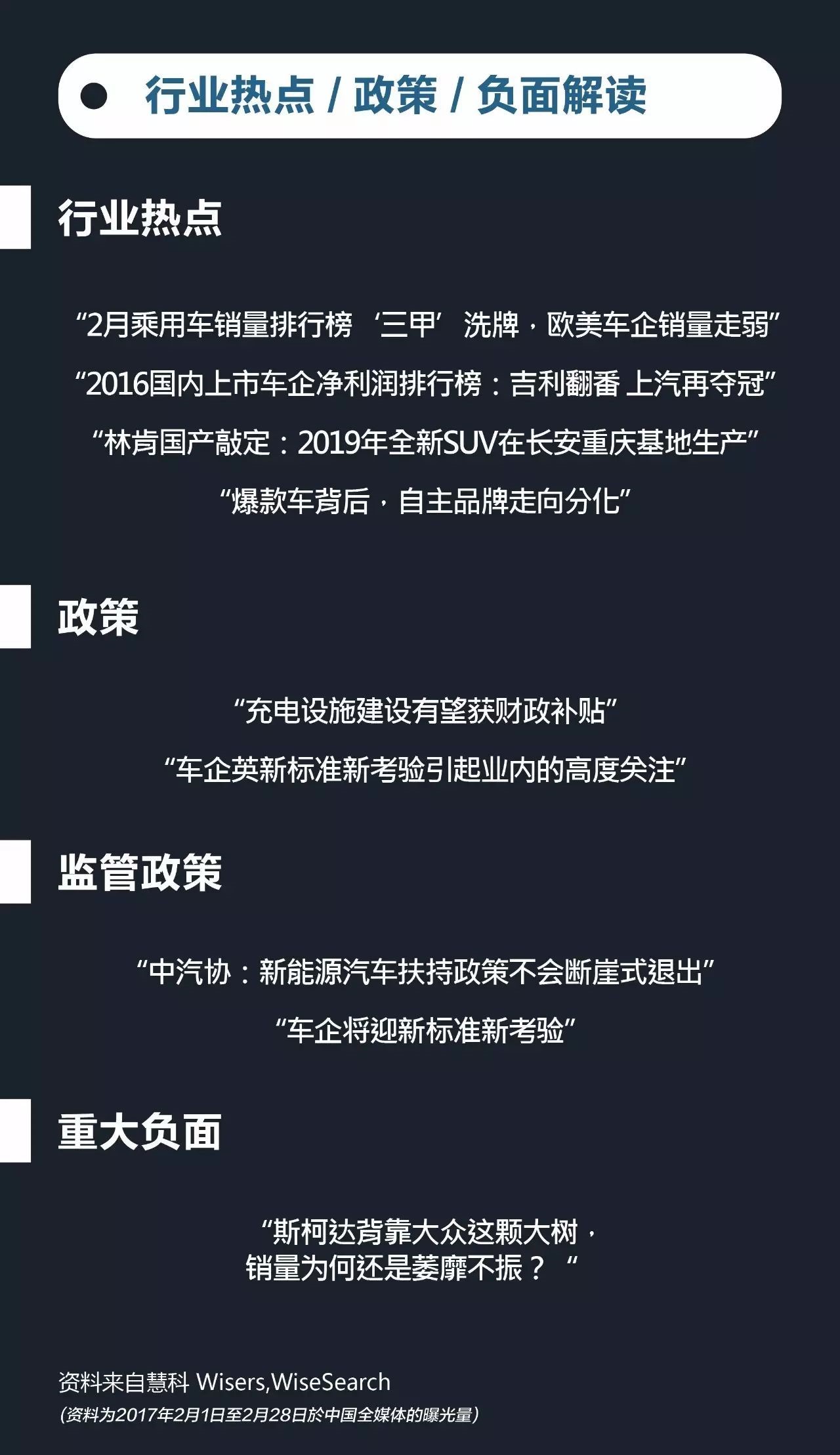 【摘要】本期慧科訊業AI大數據媒體監測時間,慧科小編將為大家呈上2017年2月《汽車行業傳播分析報告》,從多個維度解讀2月國內乘用車市場的新聞傳播態勢、行業熱點和政策以及重大負面,為您的經營管理提供參考。