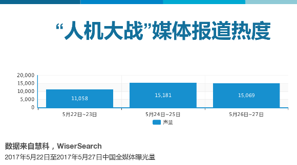 在柯潔對戰(zhàn)AlphaGo的三場比賽期間,慧科大數(shù)據(jù)平臺共監(jiān)測到全媒體對三場賽事前后6天的新聞輿論總聲量為48265篇,隨著柯潔第一戰(zhàn)的落敗,第二戰(zhàn)更受關(guān)注,5月24至25日輿論聲量達到15181篇。