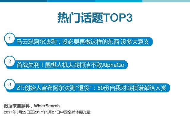 在慧科大數(shù)據(jù)平臺監(jiān)測到的輿論聲量去噪后,排名前三的討論話題分別是馬云對該次比賽的評價、首戰(zhàn)失敗的消息以及AlphaGo退役的消息。