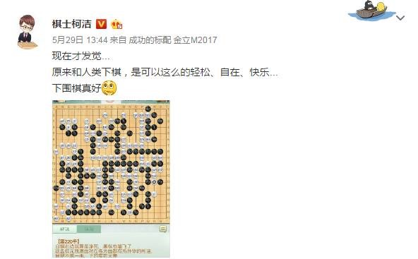 不過好在盡管情緒受到了影響,但柯潔的棋藝看起來也因此大幅進步,隨后的5月29日第22屆LG杯世界圍棋棋王戰(zhàn)32強戰(zhàn),柯潔大勝韓國棋手,并發(fā)微博感嘆:“原來和人類下棋,是可以這么的輕松、自在、快樂……”有人調(diào)侃到,畢竟他是“和上帝交過手的男人”了。