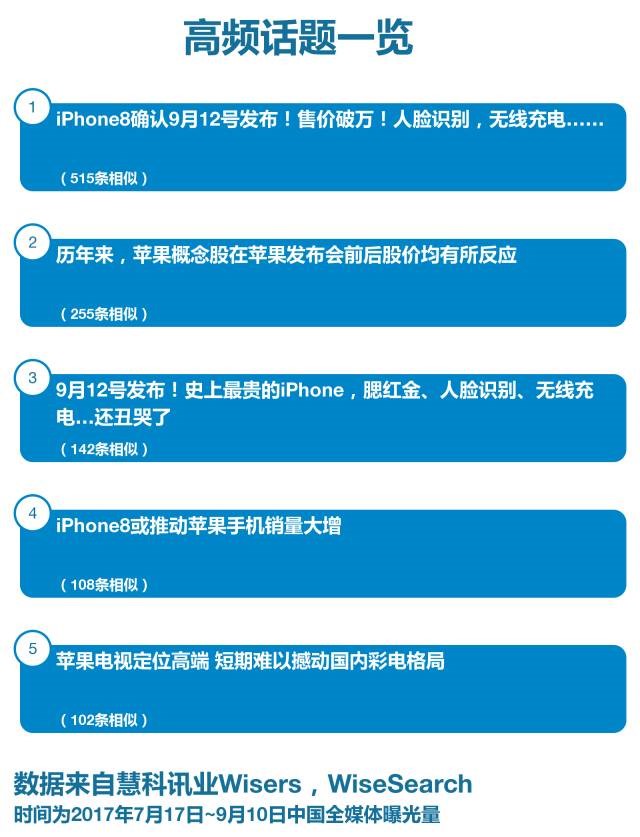 從監(jiān)測到的高頻話題來看,關(guān)于蘋果發(fā)布會的預(yù)告的報道最多。在金融投資領(lǐng)域,對蘋果概念股的解讀內(nèi)容亦被廣泛報道。其次,每年蘋果發(fā)布會之前,對蘋果新產(chǎn)品的猜想,也是媒體津津樂道的內(nèi)容之一。