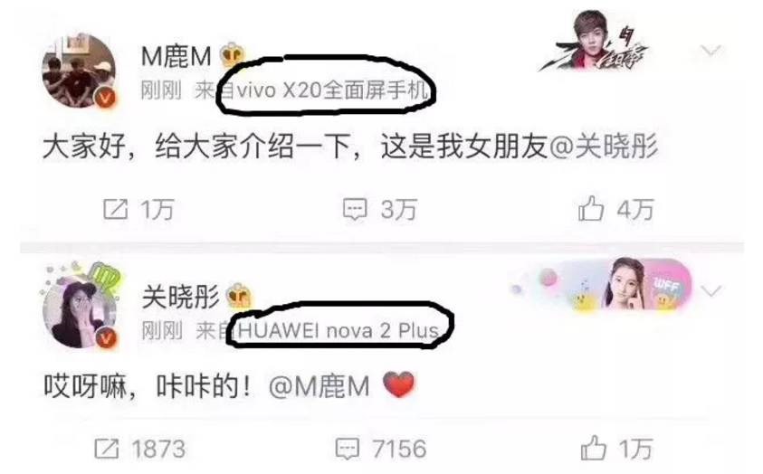 雙方代言的vivo X20手機(jī)和華為nova手機(jī)獲得大量曝光,成為大贏家。雙方發(fā)布微博之時(shí),鹿晗微博顯示手機(jī)發(fā)布端是vivo,關(guān)曉彤的手機(jī)發(fā)布端是華為,這意味著vivo和華為的兩部手機(jī)也同樣展示在了8億多網(wǎng)民面前。