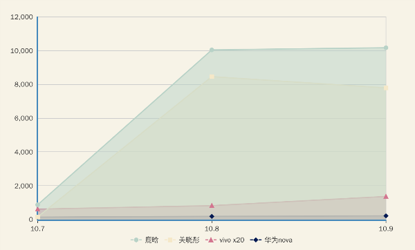 不久前才宣布代言人為鹿晗的vivo手機(jī),可謂收下了一份“厚禮”,媒體討論聲量短時(shí)大漲200%。而華為nova代言人為關(guān)曉彤這件事,也因此眾人皆知,——據(jù)微信指數(shù)顯示,華為nova在10月8日日環(huán)比增長幅度達(dá)到92.55%。