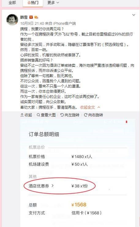 韓雪,國內知名女演員,輿論號召力強大。10月9日,韓雪發言表示攜程“捆綁消費”: