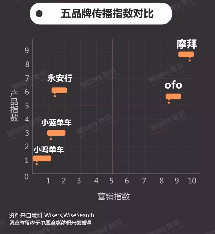 產品指數和營銷指數兩個維度上,摩拜和ofo雙雙占優。摩拜、ofo傳播內容以“融資”“節日促銷”“區域促銷”“智能車型”為主,同時摩拜與ofo兩者“相愛相殺”,在營銷推廣、產品區域投放等環節形成強烈的對比,提升了用戶對兩品牌的印象,塑造了共享單車市場兩家獨大的市場地位。