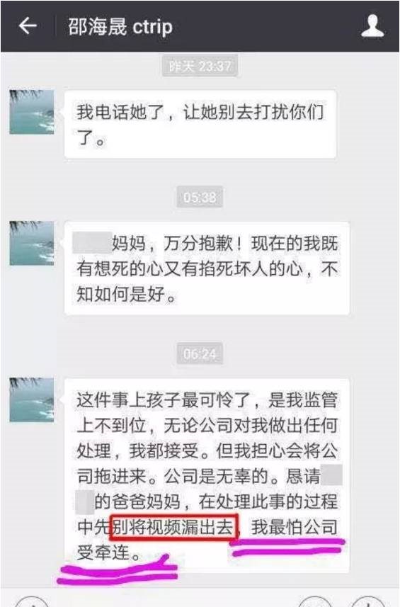11月3日,家長向攜程投訴反映問題。11月6日,攜程人力資源部門帶著員工來到親子園調看監控,隨后發現上述事件。但是,攜程內部第一時間不是直面問題,而是企圖壓制消息,公司高管希望員工不要擴散消息。例如,攜程旅行網人力資源部高級總監邵海晟游說家長“別將視頻露出去”。