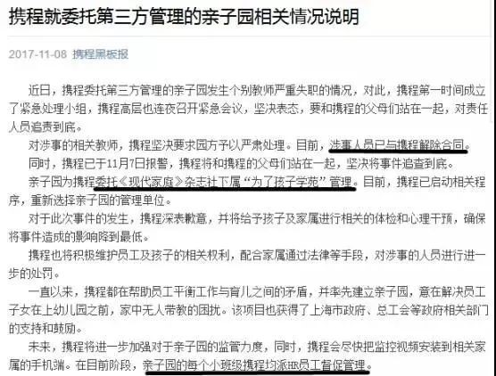 從11月6日虐童事件爆出,攜程內部管理層沒意識到嚴重性,6~7日沒有管理層人員出面處理此事情,家長在網上控訴時直指“沒有一個可以作主的領導”。