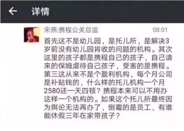 此言大意可以解讀為:“首先攜程的熊孩子沒人要。其次我家保姆虐我家娃是我自家事。第三我貼錢而且一天管四頓飯,是皇恩浩蕩,大眾不該多事。第四我們攜程不養閑人,懷孕生育養崽,到時候別怪我們把你優化出團隊。第五,內部驚現豬隊友,捅破事大家都不好過。”(來自網絡)