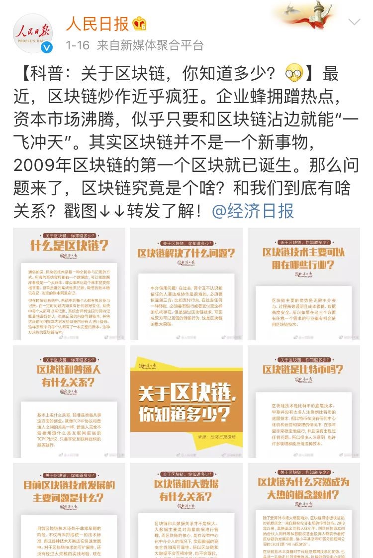 另一方面,近日中央直屬黨報《經濟日報》精心制作了“區塊鏈”的科普圖文并發布,然后“人民日報”“央視財經”等高級別官媒均進行了轉發。是何用意呢?