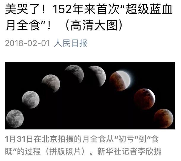 2018年1月31日,月亮女神上演“月全食血月+超級月亮+藍月”三景合一的天文奇觀,據稱是152年一遇!