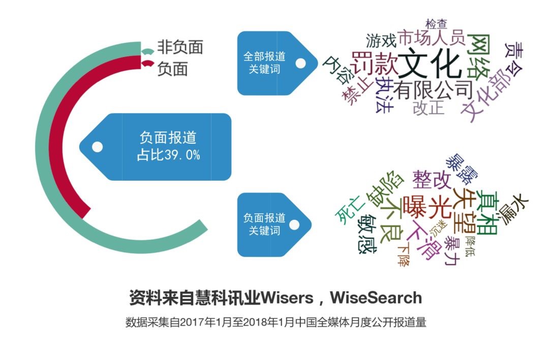 不過另一方面,該游戲傳播話題的負面報道占比居高不下。在2017年1月至2018年1月底全網傳播內容中,負面占比為39.0%。