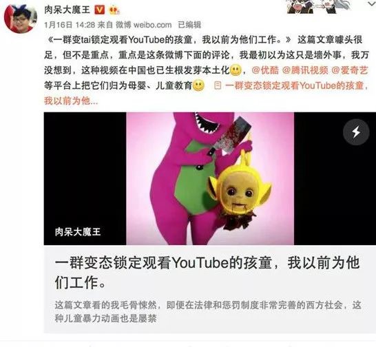 1月16日,某網友發布一則微博,在優酷、騰訊視頻、愛奇藝等眾多視頻網站的母嬰、親子欄目里,一些涉及兒童暴力、恐怖、色情等不良題材的視頻從國外流入國內互聯網,被少年兒童等人群大量瀏覽。該微博很快引發網民大量轉發評論。
