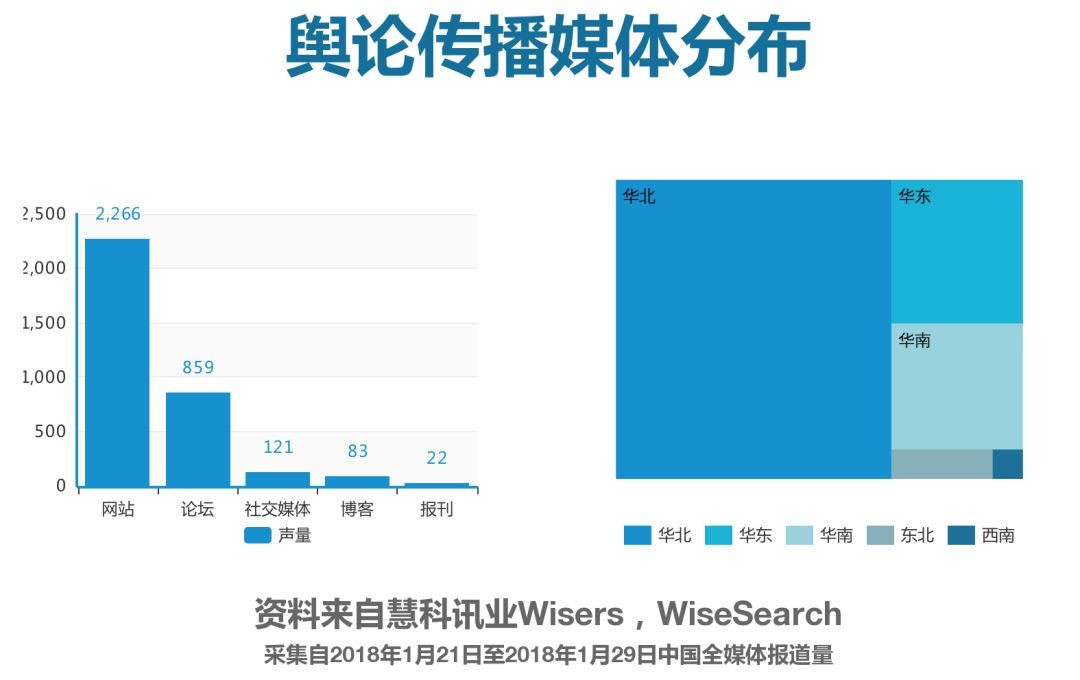 媒體類型分析顯示,話題傳播以網站與論壇為主,社交媒體上傳播聲量占比低;媒體報道地域方面以華北為主。