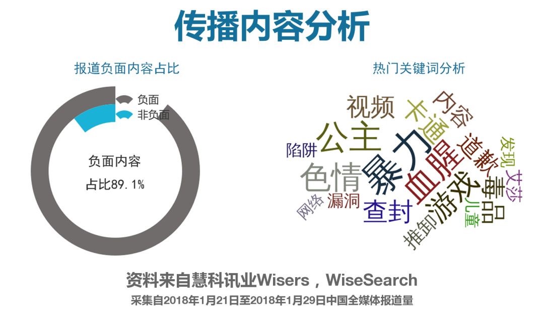 【摘要】2018年1月中旬以來,“兒童邪典片”受到公眾關注,動畫、兒童劇形象的視頻內容充斥著黃色、暴力、虐待、血腥,遭到了國內外的普遍質疑。事件曝光后,相關部門迅速行動,對相關內容進行清查整頓。其中包括廣東胤鈞公司等單位因涉嫌傳播此類信息被查封。本期慧科訊業AI大數據媒體監測時間,慧科帶您回顧此次事件的來龍去脈、為您分析事件引發的網絡輿論聲量、洞察事件帶給企業的輿情監測方面的問題和思考。
