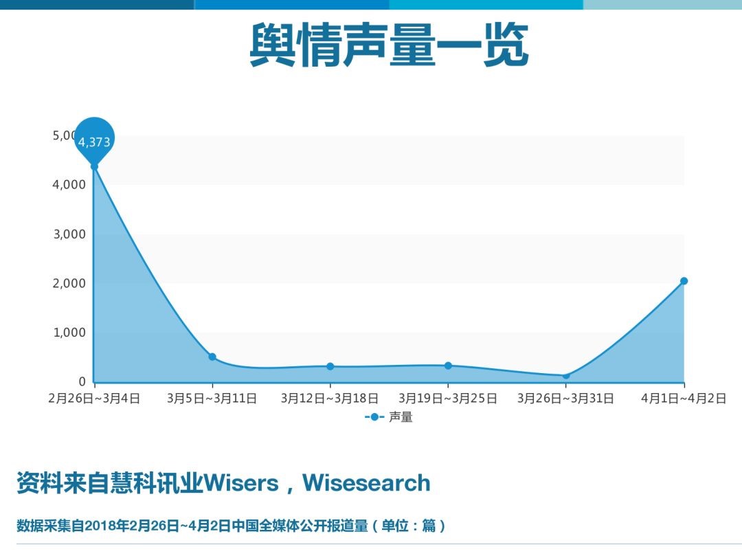 根據慧科訊業AI大數據平臺媒體監測顯示,自2018年2月26日起至4月2日,有關該傳聞的新聞報道共有7628篇,在首周(3月4日前)的新聞報道聲量最高,為4373篇,媒體主要內容為對該事件真實性的猜測與事件走向的分析。
