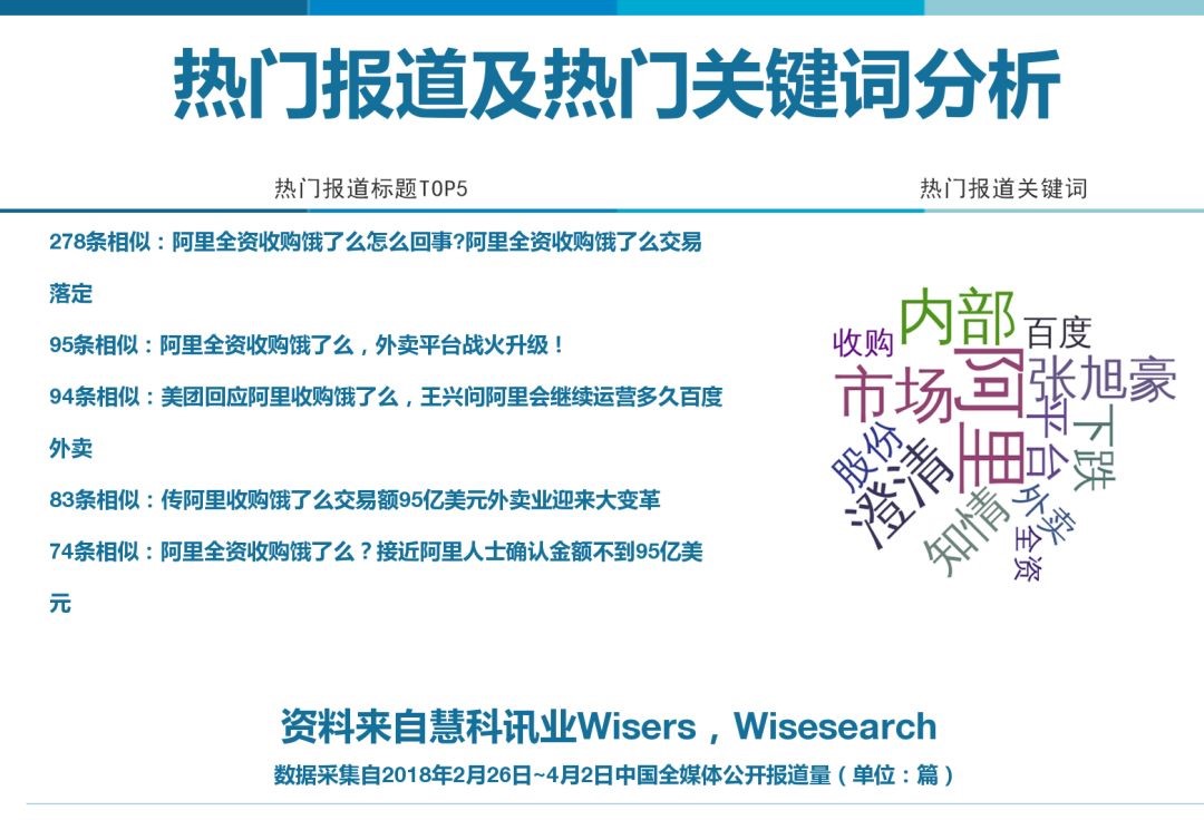 【摘要】近期,互聯網收購大潮再起。其中少不了“AT大戰”的味道,互聯網行業格局再生變動。本期慧科訊業AI大數據媒體監測時間,慧科選取“阿里全資收購餓了么”事件為代表進行大數據分析,來分析互聯網各行業巨頭格局變化。相關信息為您的經營管理提供參考。