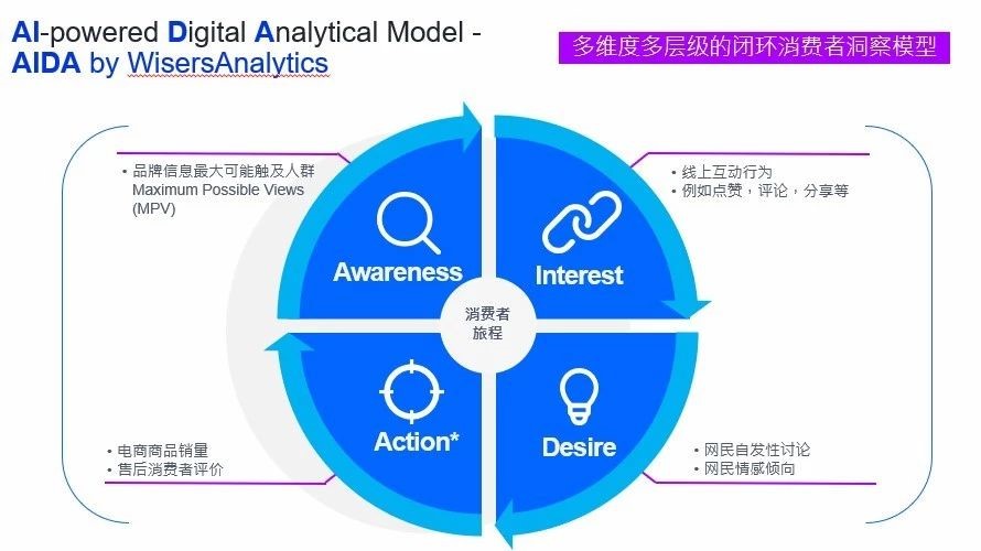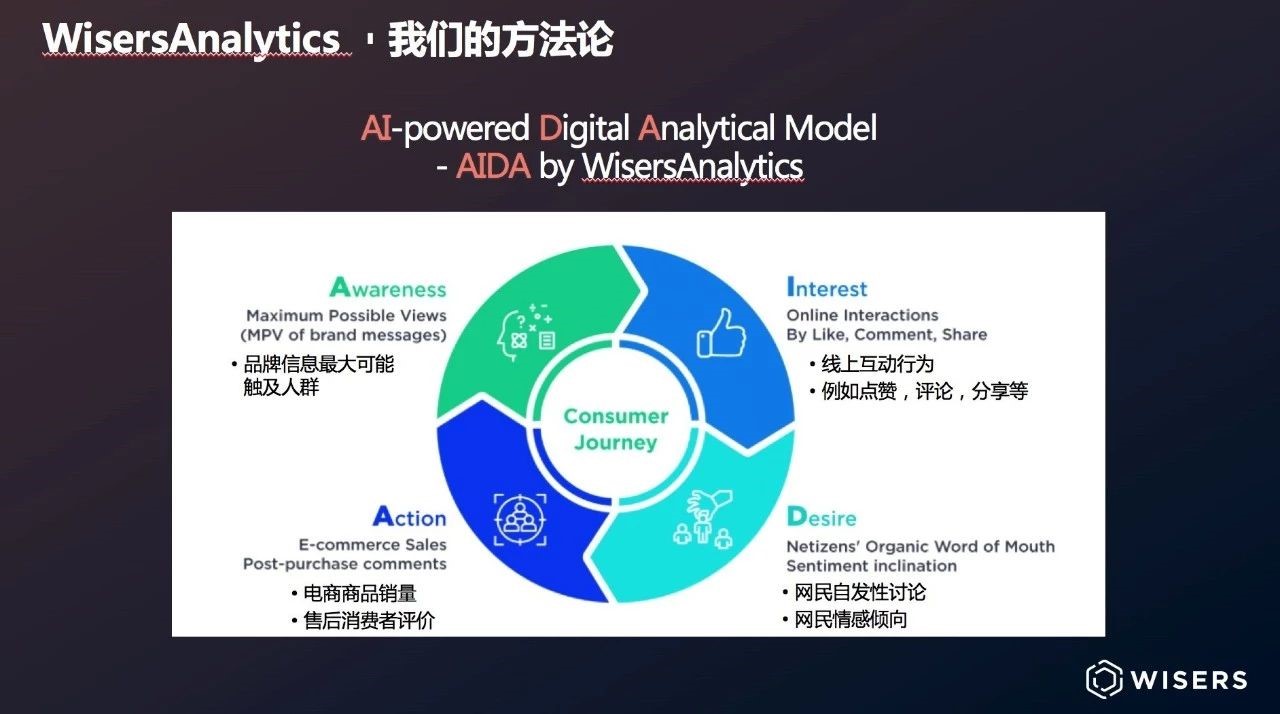 WisersAnalytics專有的AIDA(AI-powered Digital Analytical)分析模型以消費(fèi)者旅程為出發(fā)點(diǎn),根據(jù)用戶對品牌的認(rèn)知、興趣、口碑與行為進(jìn)行精準(zhǔn)的追蹤。AIDA能夠幫助品牌量化目標(biāo)群體、品牌互動、購買意愿、情感輿論與實(shí)際銷售等營銷概念, 從而提供深度見解。