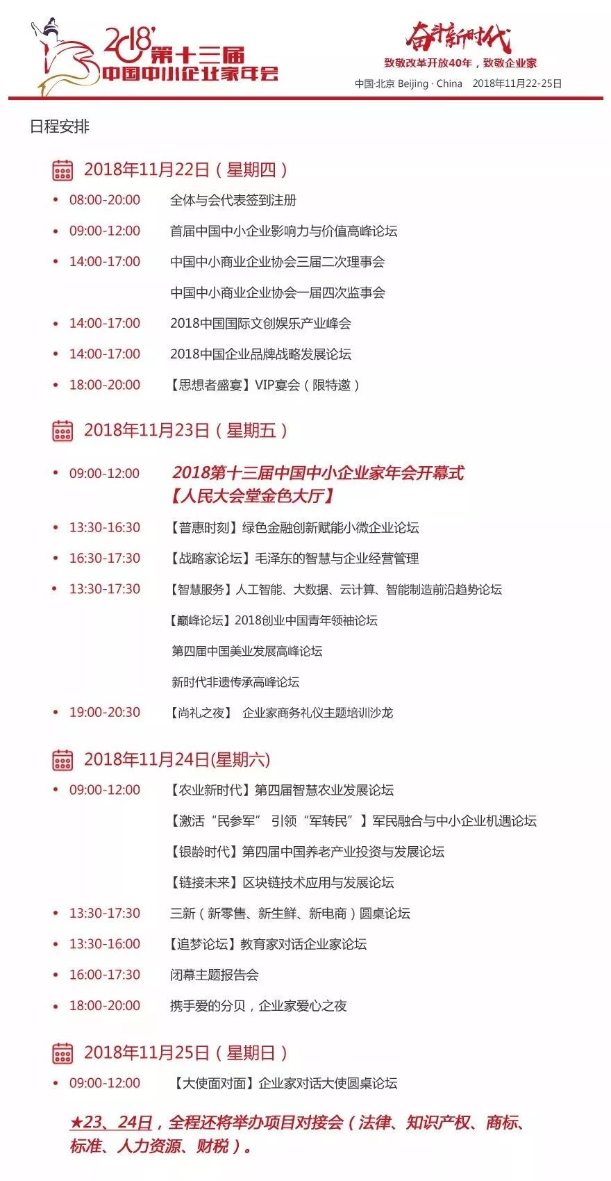 為致敬改革開放四十周年,此次主題為“奮斗新時代:致敬改革開放40年 ,致敬企業家”的中國第十三屆中國中小企業家年會盛宴將于2018年11月22—24日在北京召開。