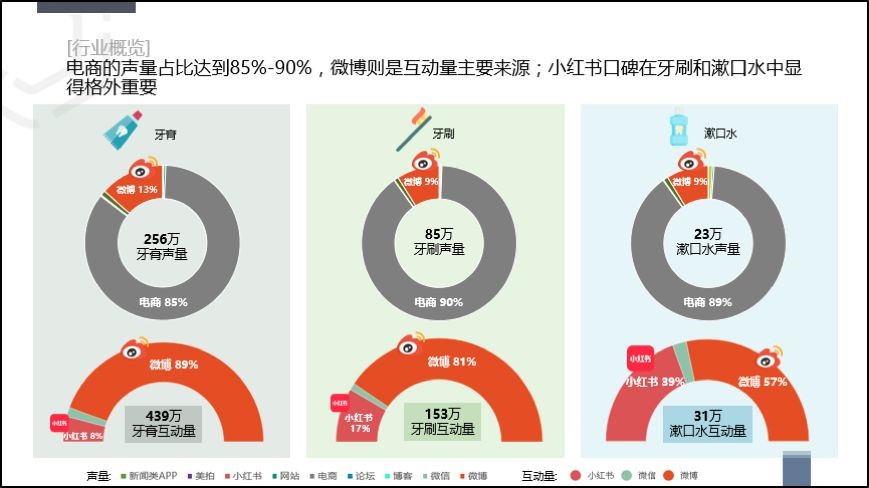 《報告》顯示,在2018年上半年,微博從代言人到明星同款,全方位針對年輕受眾群,在提高品牌曝光度方面具有絕對優勢, 對行業互動量的貢獻超過80%。微信由時尚美妝類自媒體傳輸口腔護理中的愛美概念,小紅書評測干貨得到官方美妝賬號轉載,由此建立產品口碑提高購買欲望。而在漱口水這個品類中,小紅書以不到1%的聲量,貢獻了整個品類接近4成的互動量,凸顯小紅書口碑效應的重要性。