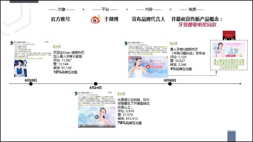 如今年8月份某品牌宣布迪麗熱巴成為新代言人,利用代言人本身的強大號召力,此舉一出即激發了行業聲量與互動量的峰值。該品牌趁熱打鐵,在宣布新代言人四天后, 發起圍繞代言人的主題活動#解封雪公主#,并注入故事元素預熱新品發布,同時線上直播的新品發布會,讓“熱巴同款”牙膏受到粉絲熱捧。