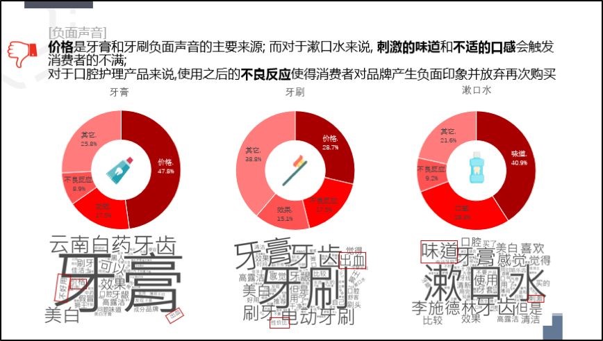 由此可見,如果要迎合消費者習慣,需要將視覺、味覺、功效等期望疊加,設計最佳口腔護理組合,以提升整體的滿意度。而那些性價比過低、美白效果不理想、以及使用后不良反應引發的消費者負面評價會大大降低再次購買的意愿。