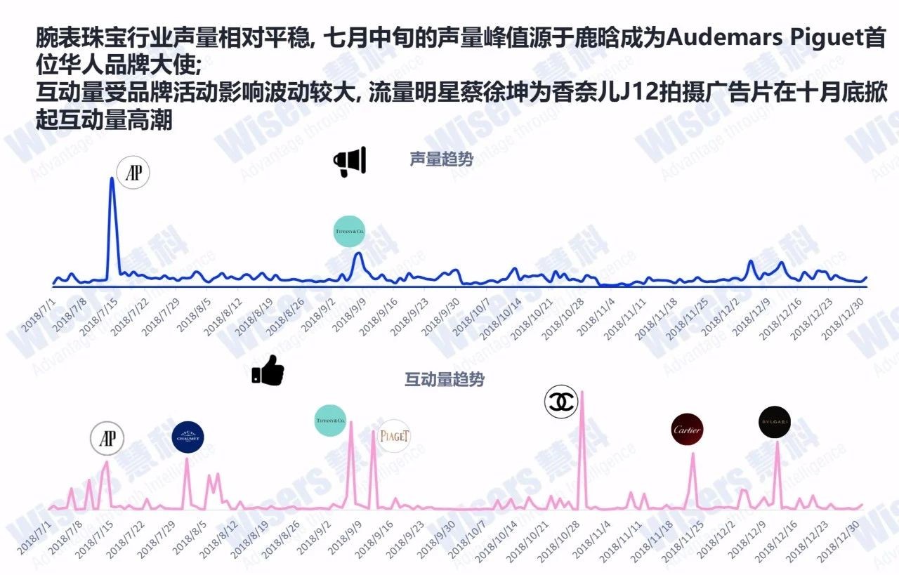 在行業聲量和互動量方面,腕表珠寶奢侈品牌在2018年下半年兩次醒目的高潮均由當紅的兩大“流量偶像”貢獻:7月中旬的聲量峰值源于鹿晗成為Audemars Piguet首位華人品牌大使,10月底蔡徐坤為香奈兒J12拍攝廣告片強勢掀起互動量高潮。