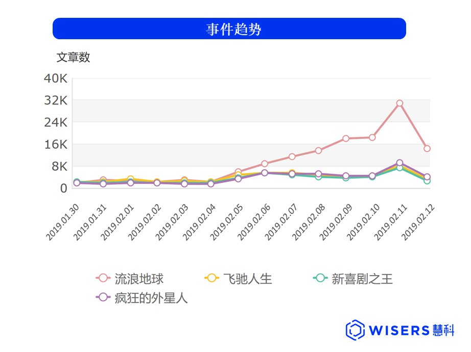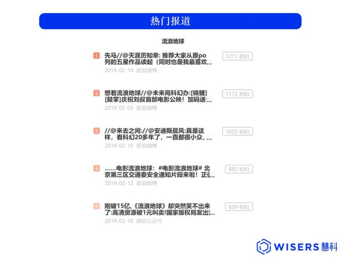 分析各片的媒介布局,我們可以清晰的看到,哪些影片是真正的觀眾的選擇。作為今年春節檔唯一一部開啟提前點映的電影,《流浪地球》在上映前就收獲眾多口碑推薦,熱門報道top5中,4篇來自新浪微博,1篇來自微信公眾號,自媒體傳播屬性明顯。