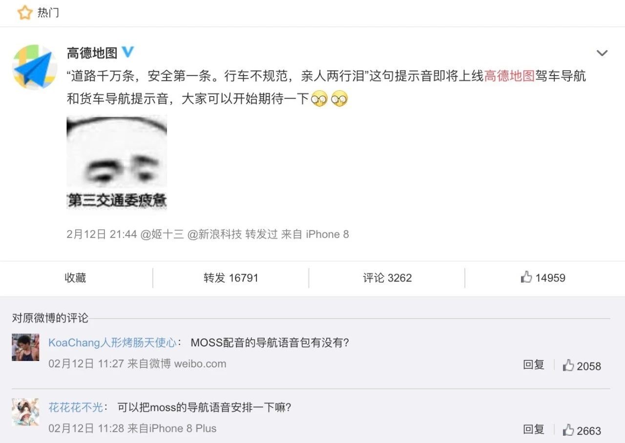2月12日,高德地圖宣布《流浪地球》的臺詞:“道路千萬條,安全第一條。行車不規范,親人兩行淚。”即將上線高德地圖駕車導航和貨車導航提示音,一經發布,就獲得了網友的高密度轉發和評論互動,高德地圖借電影東風喜提新年第一波借勢營銷。