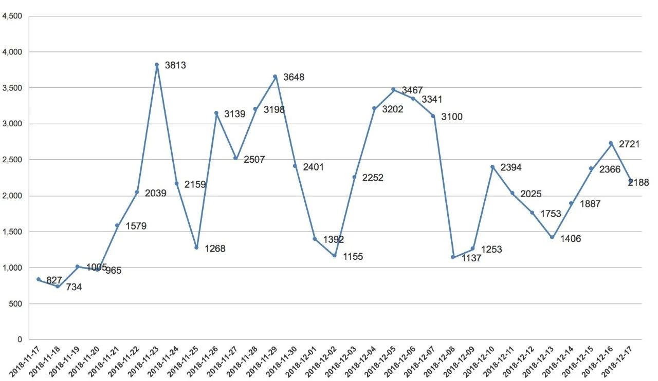 據慧科訊業AI大數據監測平臺顯示,受經營狀況下行影響,近一個月來,ofo輿論聲量一直高位運行,日均輿情聲量在2000篇次左右。