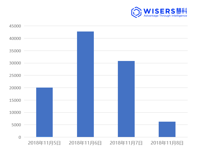 為期6天的進博會于11月10日在上海圓滿閉幕。截止到閉幕當天的中午十二點,博覽會累計進場達80萬人,超過40萬名境內外采購商到會洽談采購。據慧科訊業AI大數據監測平臺數據顯示,11月6日,報道量達42731篇次,傳播熱度高漲。