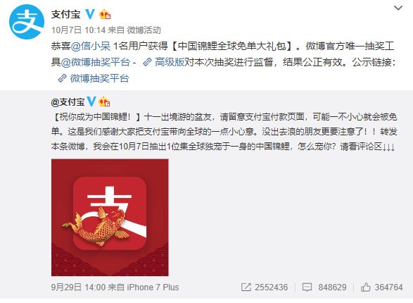 支付寶深諳社會化營銷精髓,擅長打造爆款話題。國慶期間,支付寶聯合全球200 余家品牌,在微博上發起抽獎活動,要抽取一位幸運兒送上超級大禮包,最終參與抽獎的轉發數達到300萬。信小呆,就是被抽中的中國錦鯉。