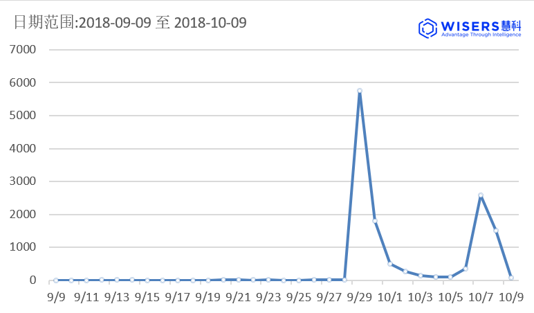 社會話題的生命周期為一周左右,熱度呈現先上升再逐漸遞減的趨勢,據慧科訊業全媒體監測平臺數據顯示,此次中國錦鯉活動中有兩次輿情峰值,分別出現在9月29日及10月7日,分別對應抽獎信息釋出及抽獎結果公布。
