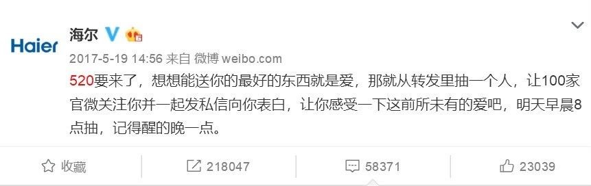 看完事件始末,是不是感覺這個套路似曾相識?此前號稱80萬藍V(企業認證賬號)總教頭的海爾,也曾有過類似營銷事件。瞄準520的節點,發起了520,百家官微齊表白活動。
