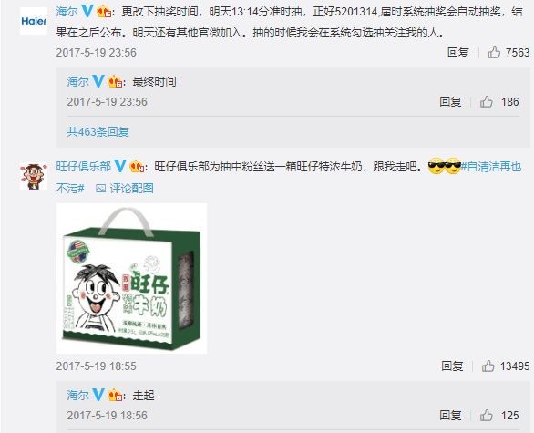 活動微博評論區內,各品牌積極互動,轉發微博,加碼獎品,品牌效應疊加,這場活動最終讓海爾收獲了21萬轉發量,近百萬的曝光量,同時,各參與品牌也贏得了曝光機會。可謂一舉多贏。而這場營銷活動,也成為“天貓618”及“中國錦鯉”營銷事件的雛形。