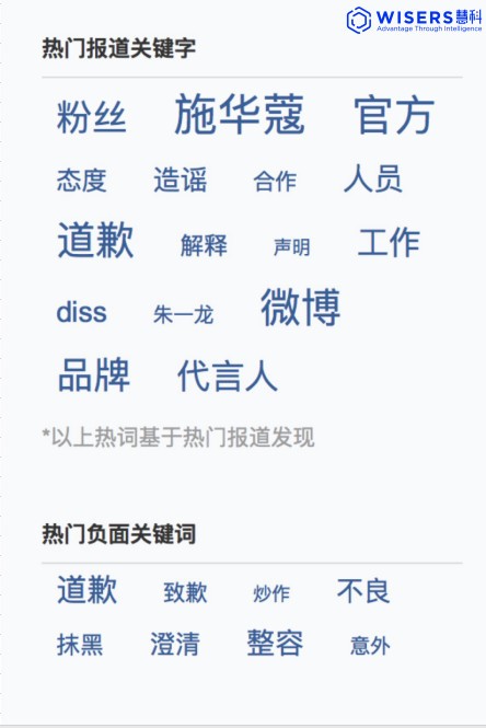 而“施華蔻”品牌熱門報道關鍵詞也鎖定在了此次負面事件中,由事件發酵的相關“道歉”、“diss”、”造謠“、”聲明“、等詞語占據了大部分聲量。