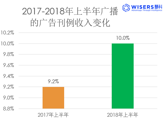 慧科訊業(yè)全媒體監(jiān)測平臺數(shù)據(jù)顯示,2018年上半年,廣播廣告整體廣告時長環(huán)比減少1.3%,刊例價環(huán)比增長10%。