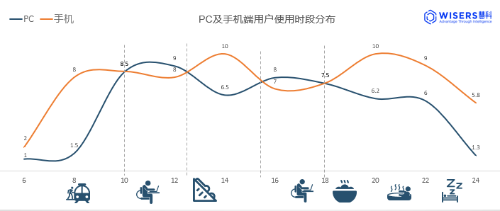 從用戶使用時段上看,PC與移動的高峰時間交替出現(xiàn),PC端的用戶活躍時段集中在白天的工作期間,而手機則分布在午間和晚間休閑時間。