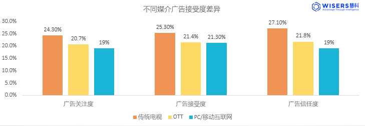 慧科訊業(yè)全媒體監(jiān)測平臺數(shù)據(jù)顯示,觀眾對OTT廣告的接受度低于傳統(tǒng)電視,但高于PC、移動端互聯(lián)網(wǎng)廣告,隨著OTT終端覆蓋率的不斷擴大,大屏運營的重要性也愈發(fā)明顯,是品牌方可以重點關注的媒介渠道之一。