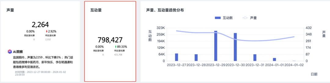 醫(yī)療行業(yè)如需加強(qiáng)數(shù)字化轉(zhuǎn)型,需要對(duì)海量媒體信息實(shí)時(shí)了解。社交媒體信息爆發(fā)式增長(zhǎng)的今天,網(wǎng)絡(luò)上對(duì)于行業(yè)熱點(diǎn)事件、話題討論、新技術(shù)趨勢(shì)、新病癥分析等分布廣泛。根據(jù)慧科WisersOne平臺(tái)監(jiān)測(cè),2023年12月27日-2024年1月2日監(jiān)測(cè)周期內(nèi),熱門話題“微博中醫(yī)藥月”熱度持續(xù)增長(zhǎng);討論聲量較高的話題有:”微博新知“、”微博健康公開(kāi)課“、”健康知識(shí)打卡月”等。本周總互動(dòng)量達(dá)到798,427,環(huán)比此前一周增長(zhǎng)89.33%。