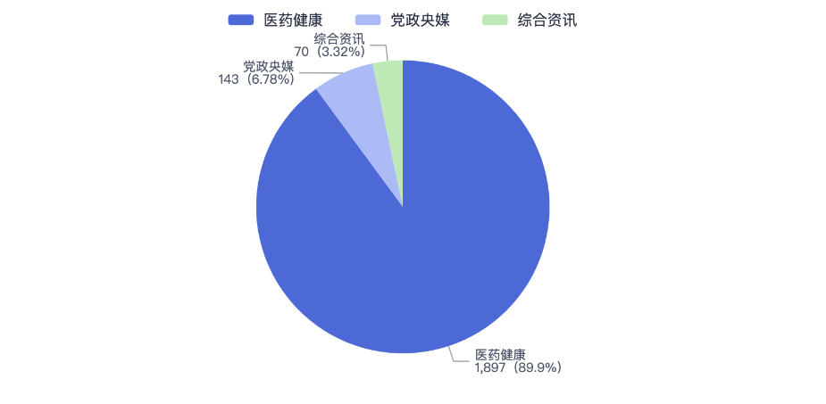 醫(yī)藥行業(yè)是一個(gè)強(qiáng)政策監(jiān)管行業(yè),對(duì)于媒體類型分布、黨政央媒發(fā)布內(nèi)容,需要實(shí)時(shí)關(guān)注。監(jiān)測(cè)周期內(nèi),慧科WiseersOne平臺(tái)發(fā)現(xiàn),醫(yī)藥健康類媒體聲量占比89.9%、黨政央媒聲量占比6.78%、其他綜合資訊類發(fā)文占比3.32%。其中黨政央媒熱議話題包括“人民名醫(yī)直播”、和“健康60s”。