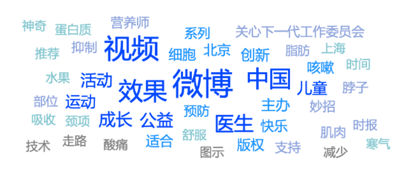 從討論關(guān)鍵詞可以看出,本周熱議話題包括腫瘤防止科普、T細(xì)胞殺死癌細(xì)胞精彩過(guò)程。包含主要熱詞有:微博、視頻、效果、中國(guó)、醫(yī)生等,可見(jiàn)微博對(duì)于傳播醫(yī)療行業(yè)信息是重要的渠道之一。